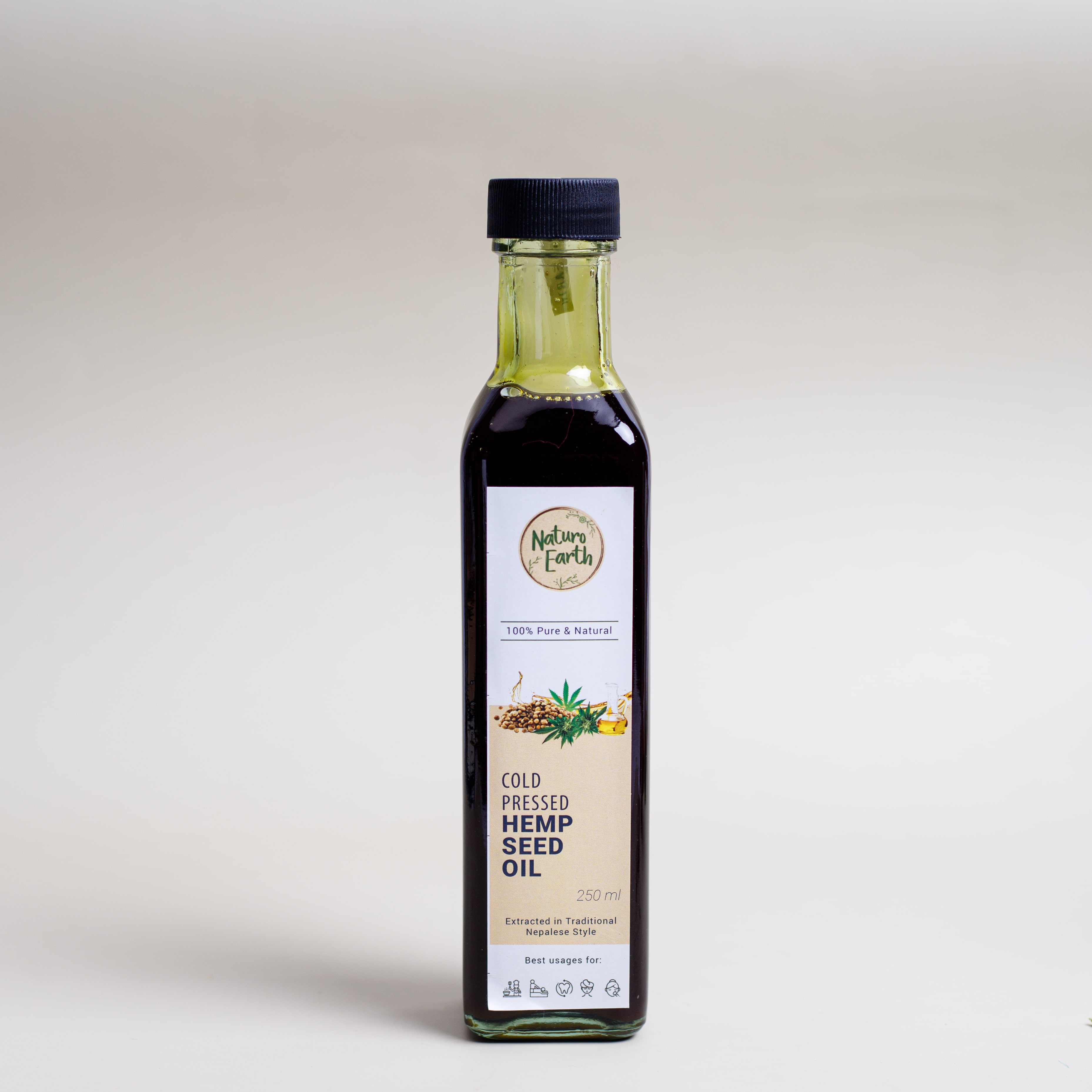 Our unrefined Hemp Seed Oil, extracted directly by cold pressing natural hemp seeds has a wide variety of uses ranging from cooking to skin care. It is rich in vitamins and carotene, an antioxidant. Additionally, it contains more Omega 3 and 6 fatty acids than fish oil. These mineral contents keeps skin healthy, prevents breakouts and fights aging. Our Hemp Seed Oil is edible just like any other oil – you can use it for frying, roasting, cooking, dressing, dips and sauces.